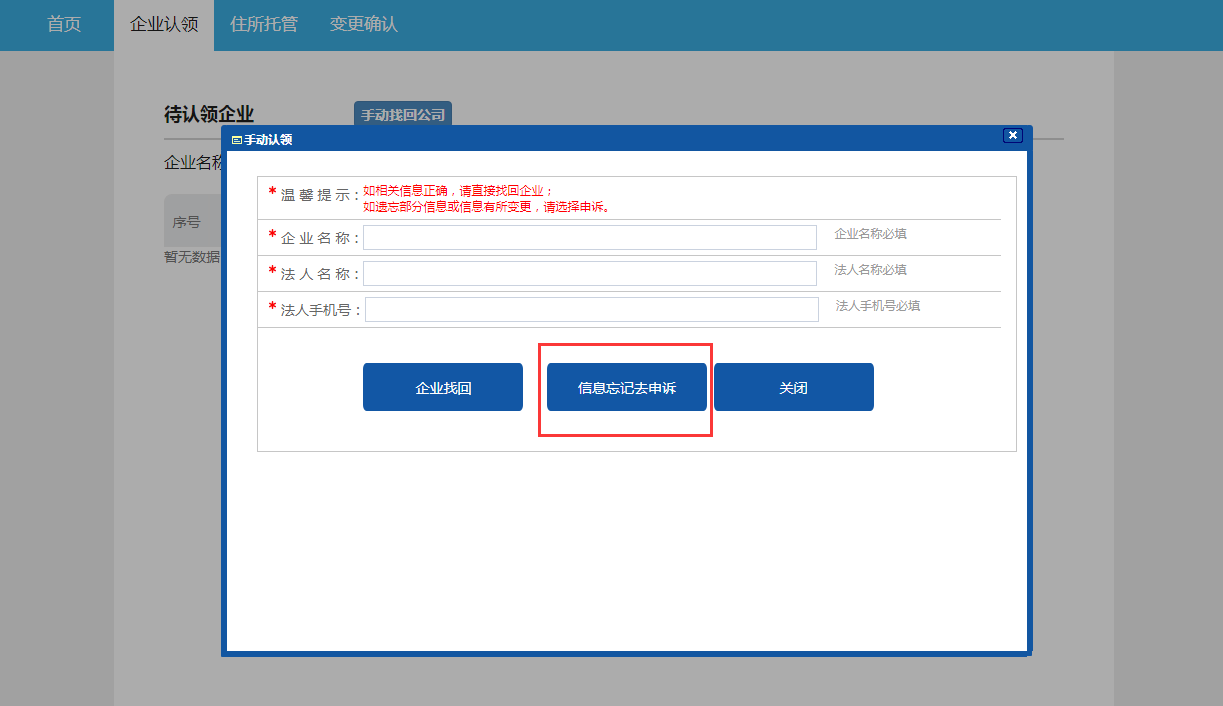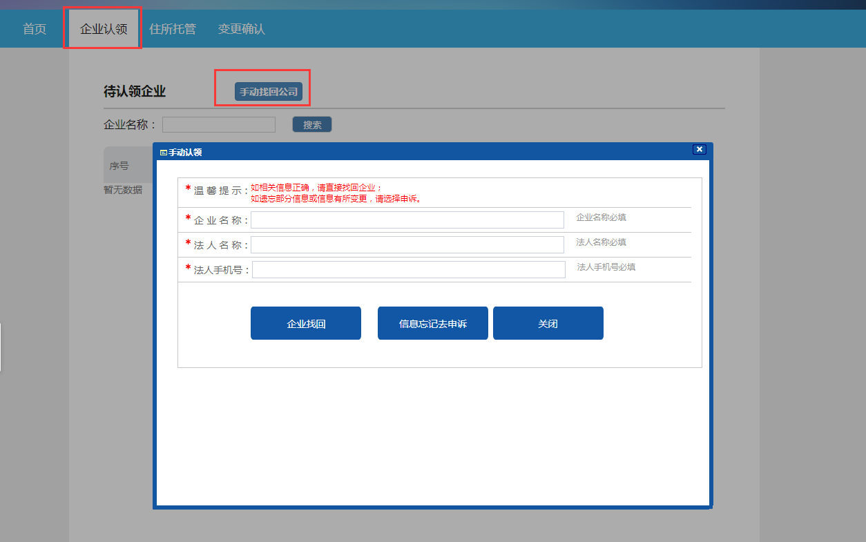 2.点击“企业认领”栏目中的[手动找回企业],在弹框中填写旧系统中最后一次办结的企业相关信息,然后点击[企业找回],即可完成认领。认领成功后,请及时更新完善企业信息。