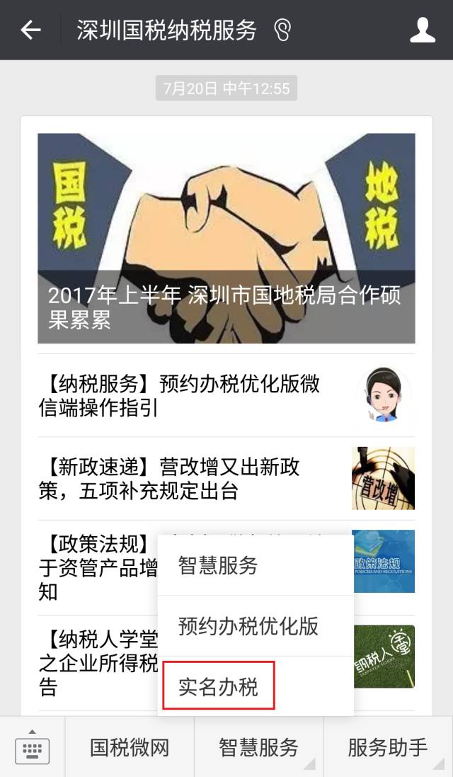 进入深圳国税微信公众号——“实名办税”模块