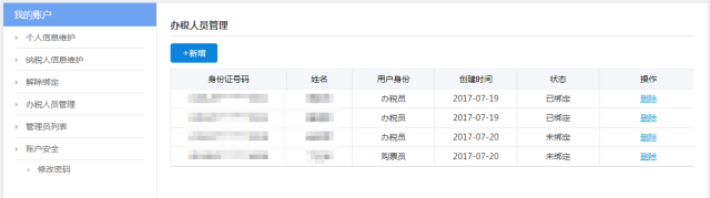 如果需要绑定办税人员(办税员、购票员等),首先需要管理员进入“办税人员管理”模块,添加办税人员信息
