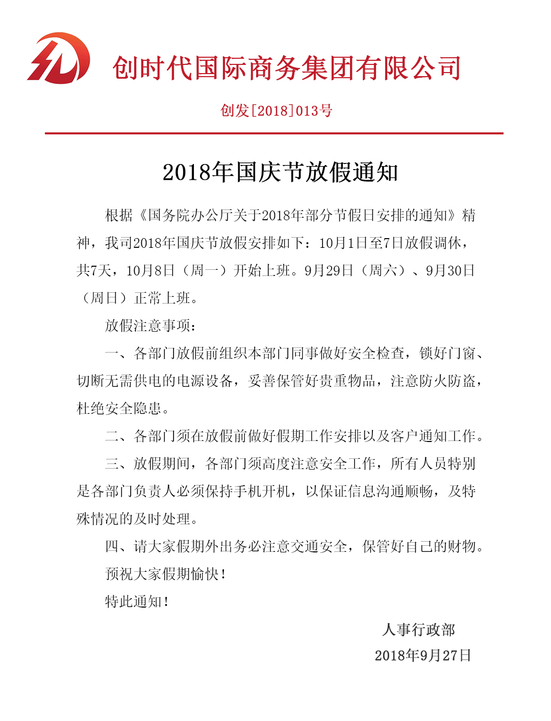 根据《国务院办公厅关于2018年部分节假日安排的通知》精神,我司2018年国庆节放假安排如下:10月1日至7日放假调休,共7天,10月8日(周一)开始上班。9月29日(周六)、9月30日(周日)正常上班。