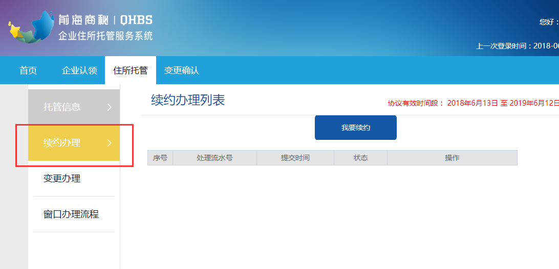 已成功托管的企业,在到期续约时,如果企业的信息没有任何变化,可选择续约业务,续约中的表格信息为不可填写状态,只需在信息表底部上传“营业执照复印件加盖公章”和“场地证明(房产证复印件或租赁凭证)”即可提交后台人员审核。