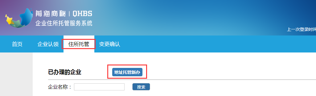 点击首页的【住所托管】,在住所托管页面点击【地址托管新办】按钮。