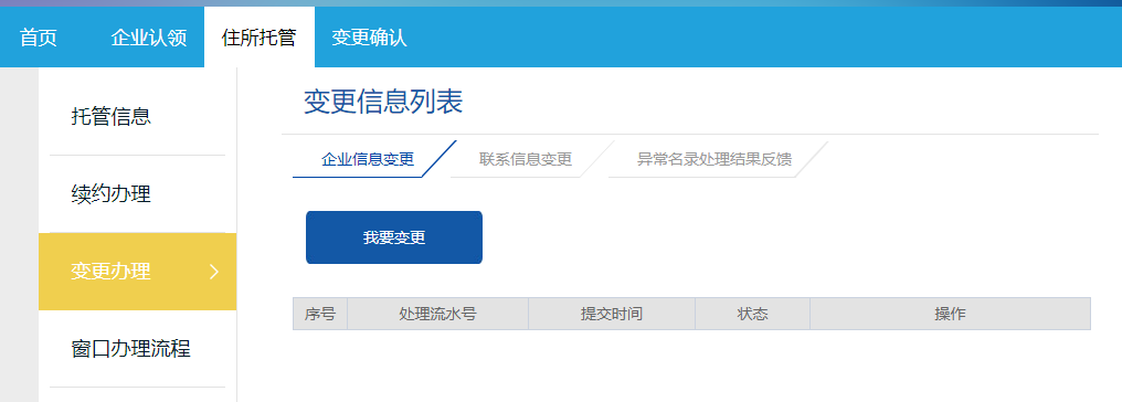 2. 在左边的菜单栏选择【变更办理】,点击我要变更。