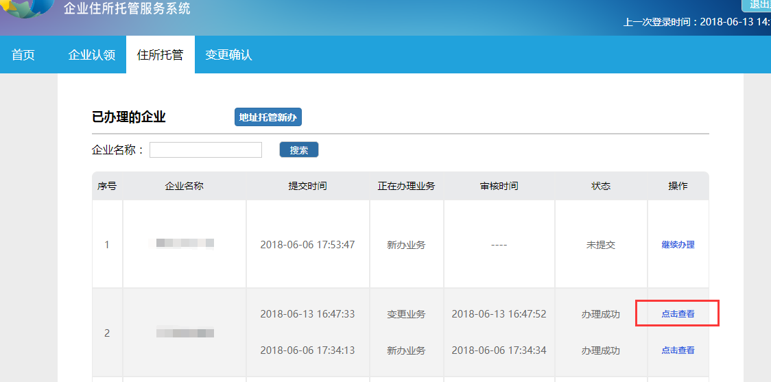 1. 在住所托管页面的企业列表中,找到想要办理变更业务的企业,点击该企业最新一条业务记录后面的【点击查看】,